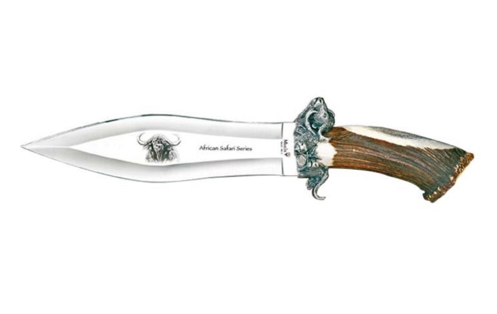 Cuchillo de lujo, hoja de acero-cromo-molibdeno-vanadio, mango de combinación de finas madera africanas, vaina rígida de cuero de antílope,con pasador para el cinturón. Se presenta en fino estuche con certificado de autenticidad y número de serie (Edición limitada de 1000 piezas) MANGO 110mm, HOJA 100mm, PESO 200g.